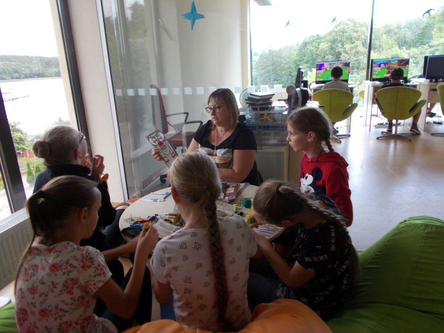 Mažosios teatro gerbėjos rinkosi į užsiėmimą mediatekoje ir gamino linksmas popierines lėles nuotaikingam spektakliui „Muzikantas, Velnias ir Perkūnas“.