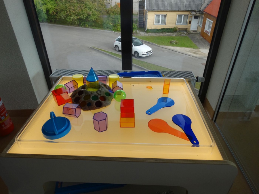 Šviesos terapija – šviesos stalas ir priemonės darbui ant šviesos stalo (geometrinių figūrų, trimačių geometrinių figūrų, kinetinio ir kvarcinio smėlio) pagalba vaikai kartu žaidžia, bendrauja, bendradarbiauja – lavina komunikavimo ir socialines kompetencijas. Kuriant įvairias dėliones, mozaikas lavina vaizduotę, meninę kompetenciją. Šviesa padeda susikaupti ilgesniam laikui.