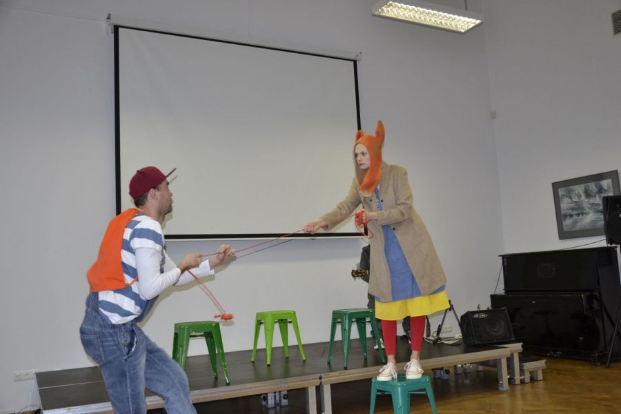 Nuotaikingame spektaklyje vaidino aktoriai Daiva Rudytė ir Paulius Valaskevičius, muzikinių kompozicijų autorius Jonas Krivickas. Spektaklyje skambant gyvai muzikai, nestigo pašėlusio, nuotaikingo ir interaktyvaus veiksmo, įtraukusio ir vaikus, ir mokytojus, ir bibliotekininkus. Kartu su aktoriais darė linksmą mankštą, rinko į delniukus laimės dulkes, skandavo skanduotes – buvo laimingi.