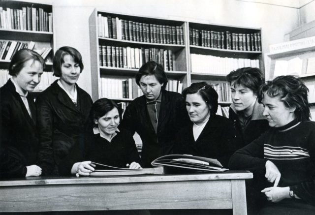 Panevėžio miesto 1-osios masinės bibliotekos darbuotojos. Iš kairės: Janina Sipavičiūtė-Arelienė, J. Simniškienė, skaityklos vedėja Stasė Mikeliūnienė, Genovaitė Žirkauskienė, bibliotekos vedėja Kotryna Dičkienė, A. Navikienė, Ada Pontežytė. Panevėžys. 1965 m. Panevėžio apskrities G. Petkevičaitės-Bitės viešoji biblioteka, PAVB F22