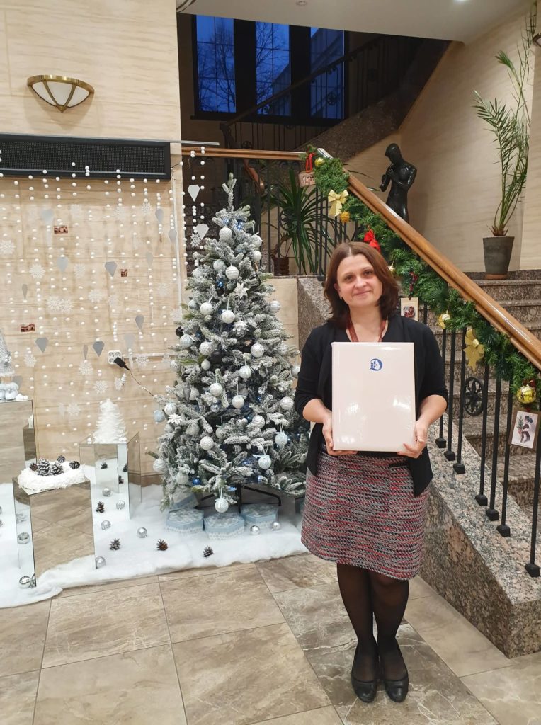 Kaliningrado srities istorijos ir meno muziejaus atstovė įteikia knygą