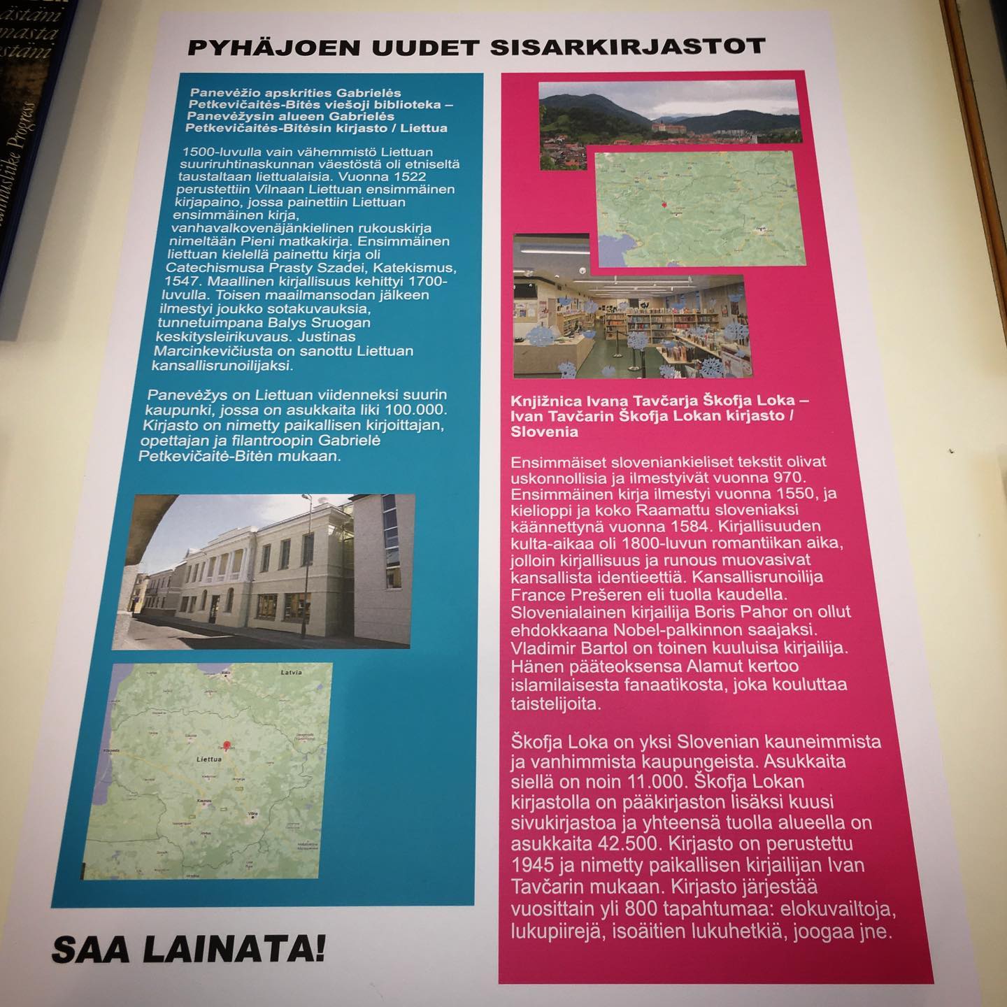 Birželio pradžioje suomių kolegos pasidalino žinia apie tai, kad jie savo bibliotekoje surengė leidinių parodą, kurioje eksponuojamos knygos apie Lietuvą ir Slovėniją. Šios šalys pasirinktos neatsitiktinai, nes Pyhäjoki savivaldybės biblioteka Europos viešųjų bibliotekų bendradarbiavimo programoje (NAPLE Sister Libraries program) bendradarbiauja ne tik su Gabrielės Petkevičaitės-Bitės viešąja biblioteka Lietuvoje, bet ir su Škofja Lokos miesto Ivano Tavčaro biblioteka Slovėnijoje. Įdomu tai, jog Škofja Lokos miesto biblioteka nuo 2015 m. NAPLE Sister Libraries programoje sėkmingai bendradarbiauja su Panevėžio rajono savivaldybės biblioteka.