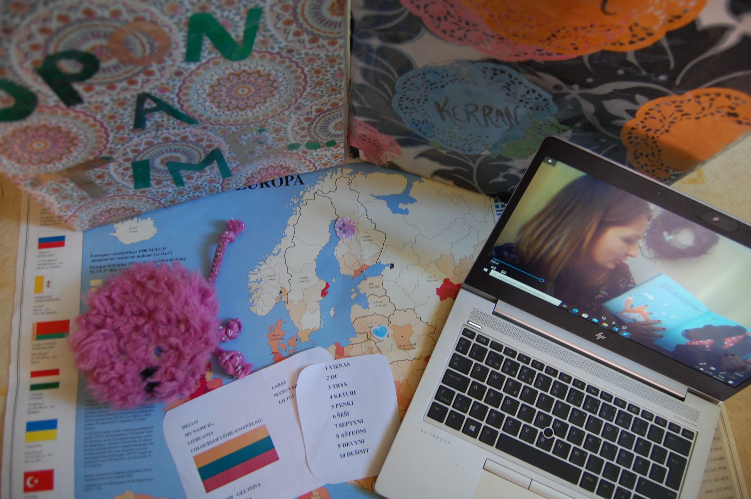 Kovo mėnesį sulaukėme pasiūlymo iš Pyhäjoki savivaldybės bibliotekos dalyvauti viename iš jų projektų, kurį koordinavo Terhi Virkkunen. Sudomino iš pažiūros paprasta, bet labai patraukli projekto idėja – Terhi dirbo su 1–6 metų vaikų grupėmis vaikų darželiuose, pusės valandos trukmės užsiėmimuose skaitydama kokios nors šalies pasaką ir supažindindama vaikus su kai kuriais tos kalbos žodžiais ir frazėmis (kaip pasisveikinti, pasakyti savo vardą ar suskaičiuoti iki dešimties). Vaikai taip pat buvo supažindinami su tos šalies vieta žemėlapyje (arba gaublyje) ir jos vėliava.