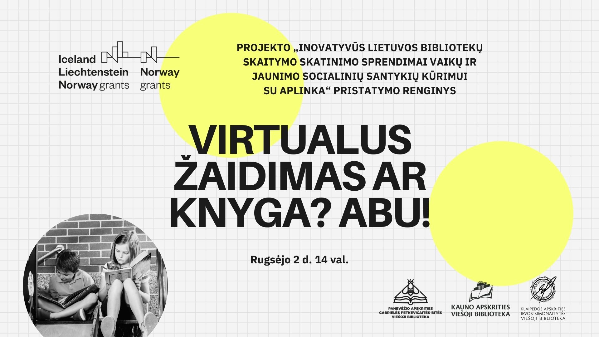 Rugsėjo 2 d. 14 val. vyks virtualus projekto „Inovatyvūs Lietuvos bibliotekų skaitymo skatinimo sprendimai vaikų ir jaunimo socialinių santykių kūrimui su aplinka“ pristatymo renginys „Virtualus žaidimas ar knyga? Abu!“. Jo metu projekto kūrėjai pristatys idėjos tikslus, numatomas veiklas ir laukiamus rezultatus. Kartu su švietimo ekspertais, psichologais ir technologijų kūrėjais aptars projekto sprendžiamą problematiką, vaikų ir jaunimo skaitymo įpročius bei technologijų įtrauktį į mokymosi procesą.