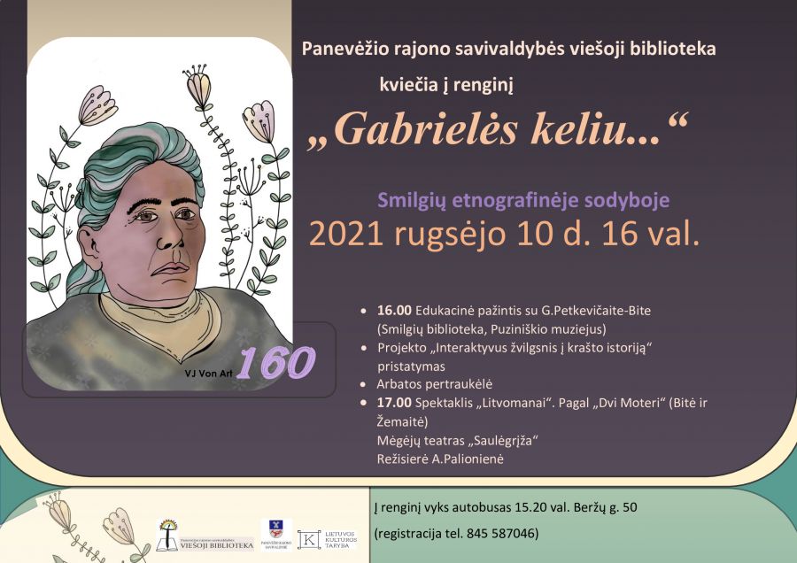 2021-aisias metais minime kraštietės, žymios asmenybės G. Petkevičaitės-Bitės 160-ąsias gimimo metines. Šią sukaktį kviečiame paminėti jos gimtajame Smilgių krašte: renginys „Gabrielės keliu…” vyks rugsėjo 10 d. Smilgių etnografinėje sodyboje.