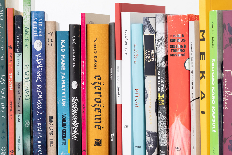 Knygų nugarėlės lentynoje