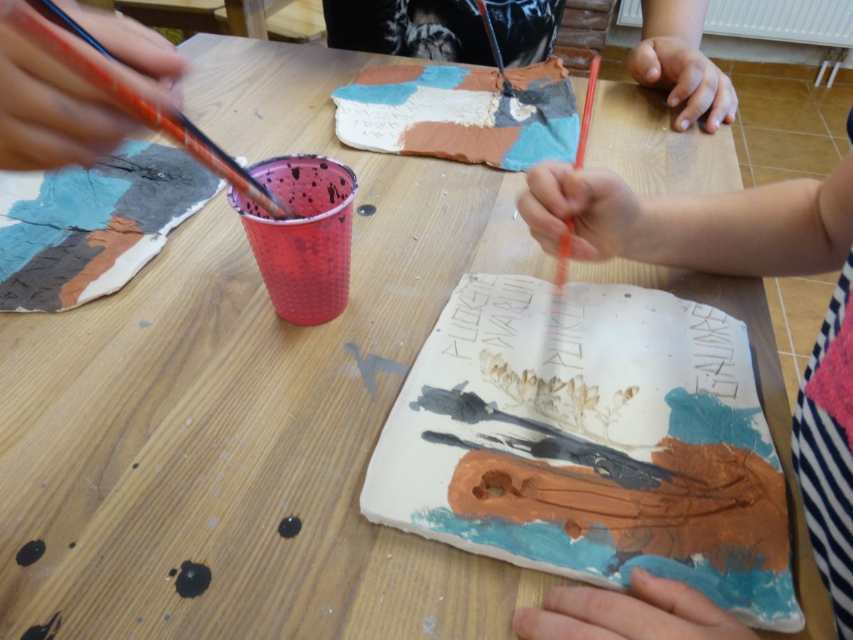 Antrojo užsiėmimo metu, kūrinių autoriams, jau išdegtus darbus reikėjo padengti glazūra. Žinoma, pirmiausia, reikėjo išklausyti keramiko Romualdo Pučeko pasakojimo apie glazūrą, jos atsiradimą, rūšis ir sudėtį. Sužinoję kaip dažyti ir išsirinkę spalvas kruopščiai dažė. Glazūruotus darbus vėl paliko išdegti elektrinėje krosnyje.
