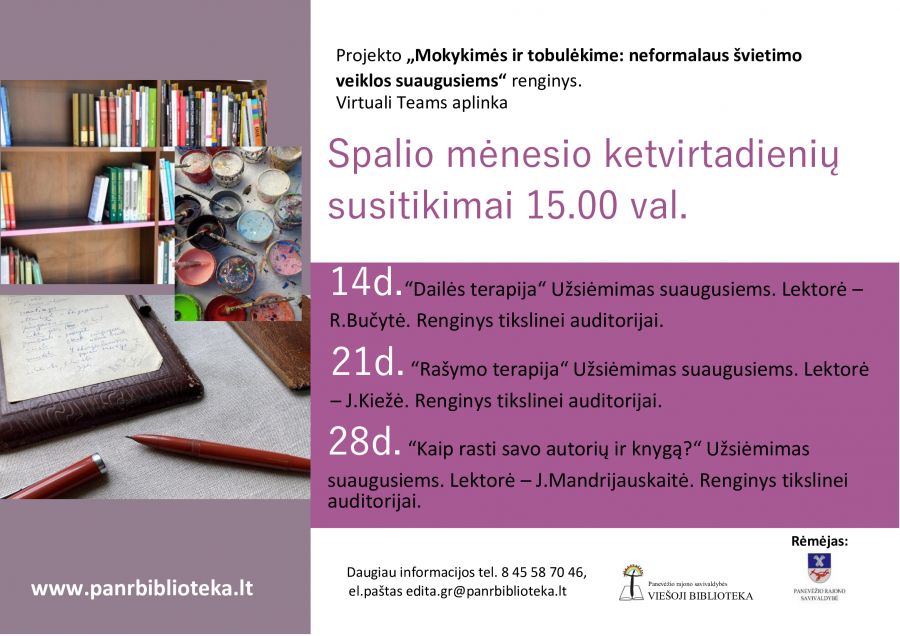 Šio projekto, finansuoto Panevėžio r. savivaldybės lėšomis, tikslas – gerinti rajono gyventojų užimtumą, saviraišką organizuojant įtraukiančias, kuriančias emocinį stabilumą veiklas. Vietų skaičius ribotas. Susidomėjusius kviečiame registruotis el. paštu edita.gr@panrbiblioteka.lt.