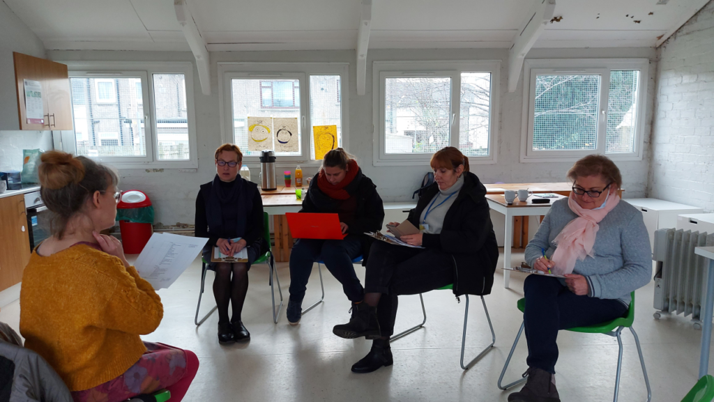 Pirmąją mokymų dieną mokymuose dalyvaujančios bibliotekos darbuotojos Greta Kėvelaitienė, Malvina Zimblienė, Rūta Juzėnienė, Angelė Mikelinskaitė ir Virginija Švedienė susitiko su Pasakojimų centro vadove Helen Mill, kuri papasakojo apie Centro įsikūrimo istoriją, ryšius su vietos bendruomene bei apie Centro veiklą.