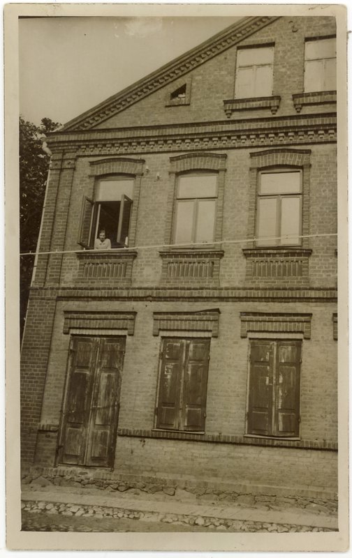 Nuotraukoje: pastatas Panevėžio bataliono g. (Respublikos g. skersgatvyje). Pro langą žiūri bibliotekininkė Pranė Brazauskaitė