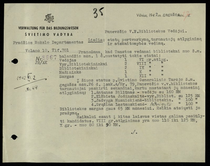 Bibliotekai patvirtinti 7 etatai: vedėjo, vyr. bibliotekininko (2), bibliotekininko (2), mašininkės, sargo.
