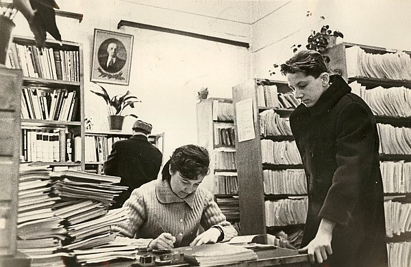 Nuotraukoje: Muzikos literatūros skyriuje vedėja Ada Pontežytė ir skaitytojas (dabar – muzikologas) Viktoras Januškevičius. 1965 m.