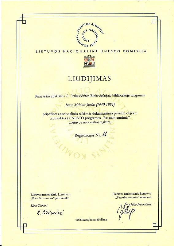 Juozo Miltinio palikimo studijų centre saugomas režisieriaus Juozo Miltinio fondas pripažintas nacionalinės reikšmės kolekcija ir įtrauktas į UNESCO programos „Pasaulio atmintis“ Lietuvos nacionalinį registrą. Registro liudijimų įteikimo ceremonija vyko gegužės 30 d. Vilniaus universitete.
