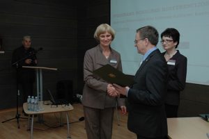 Nuotraukoje: LR kultūros ministras Remigijus Vilkaitis teikia apdovanojimą Margaritai Mašalienei. Foto V. Benašo