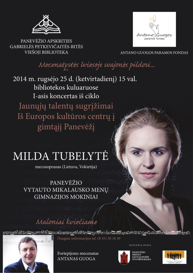 Bibliotekoje vyko šventinis koncertas „Mecenatystės šviesoj svajonės pildosi“. Vyko pirmasis projekto „Jaunųjų talentų sugrįžimai iš Europos kultūros centrų į gimtąjį Panevėžį“ koncertas. Atlikėjai – mecosopranas Milda Tubelytė (Lietuva, Vokietija) ir Panevėžio Vytauto Mikalausko menų gimnazijos mokiniai. Projektu inicijuotas jaunuomenės kultūrinių renginių ciklas Panevėžyje, kai kiekvienais metais į gimtąjį Panevėžį kviečiami koncertuoti ar pristatyti savo kūrybą įvairiose užsienio šalyse menus studijuojantys ar dirbantys jaunieji talentai.