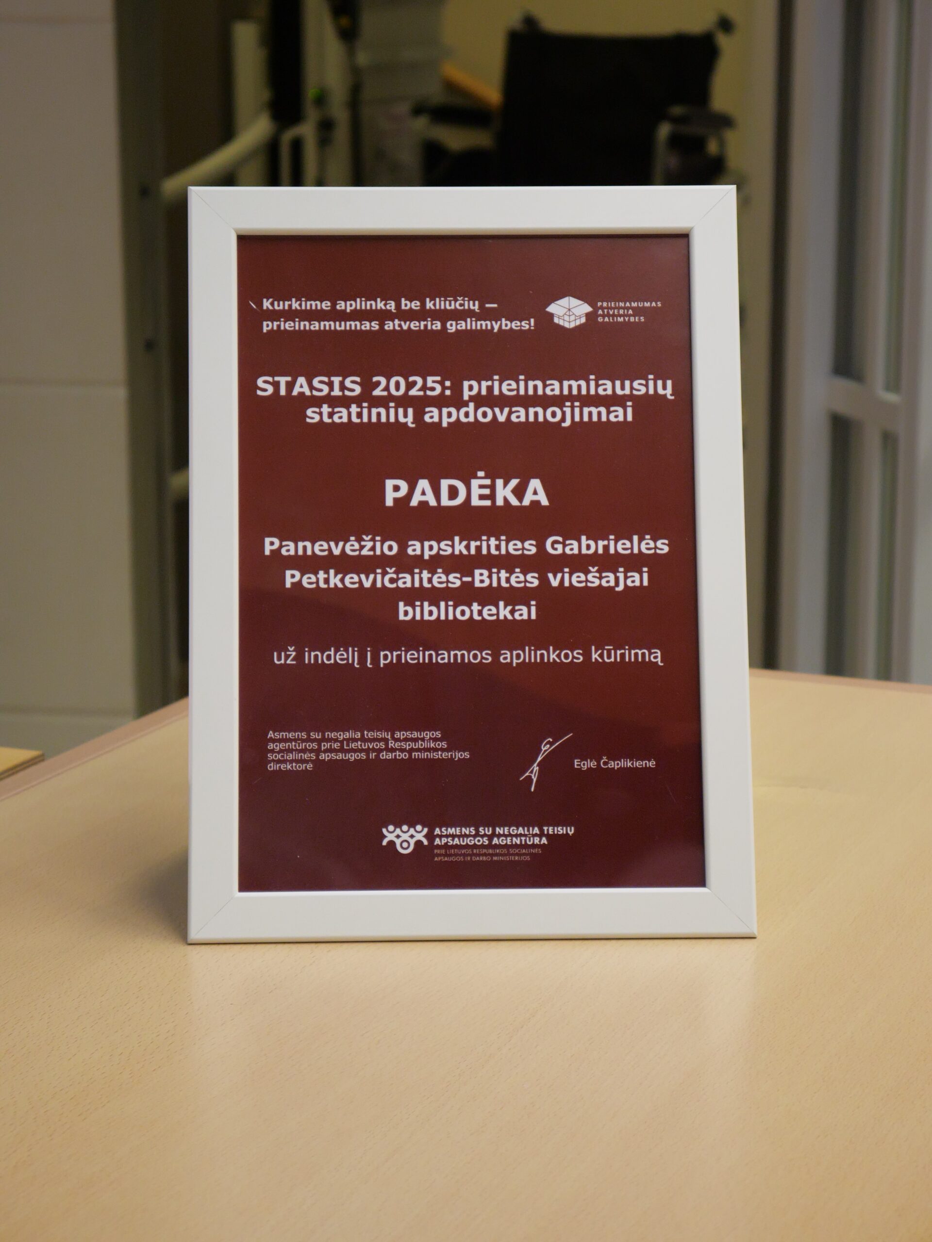 Bibliotekai įteikta Asmens su negalia teisių apsaugos agentūros prie SADM padėka už indėlį į prieinamos aplinkos kūrimą. Pirmą kartą Lietuvoje konkurse „STASIS 2025: prieinamiausių statinių apdovanojimai“ išrinkti prieinamiausi viešosios paskirties pastatai. Konkursą organizuoja Asmens su negalia teisių apsaugos agentūra.