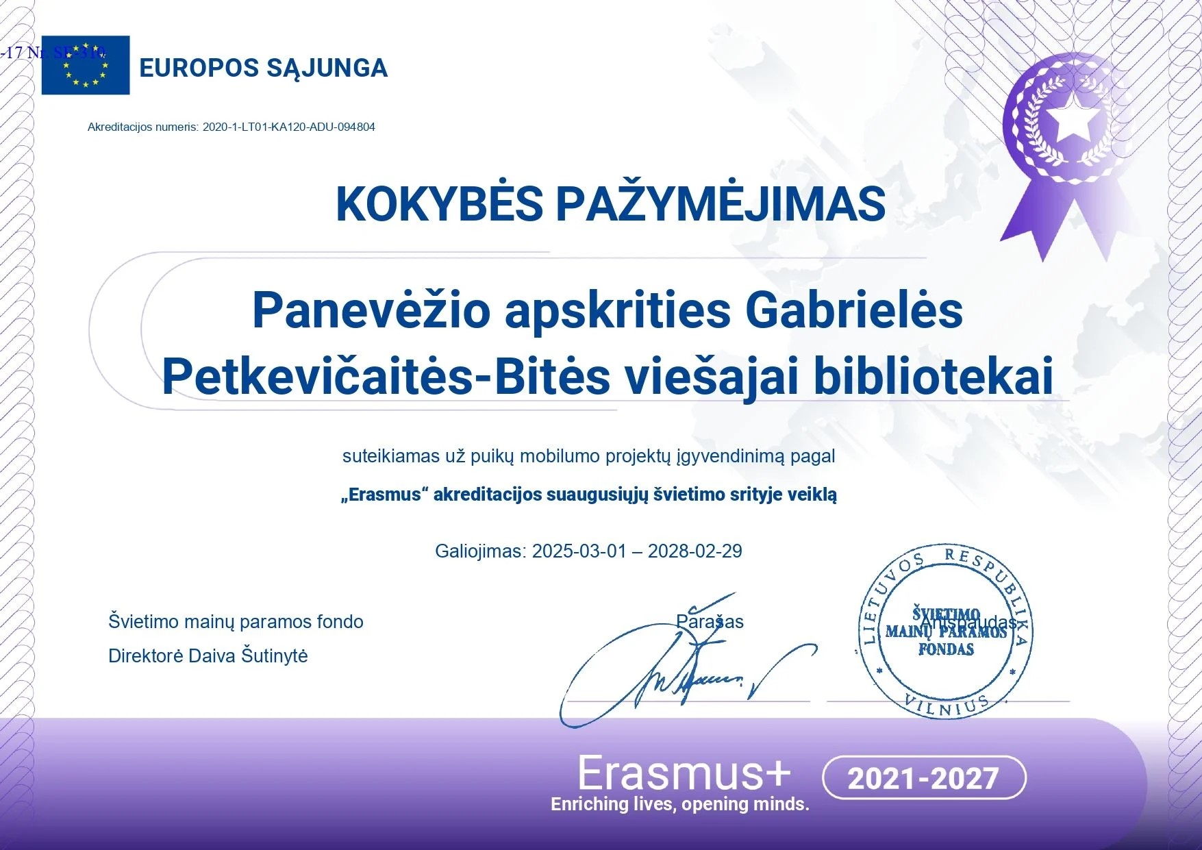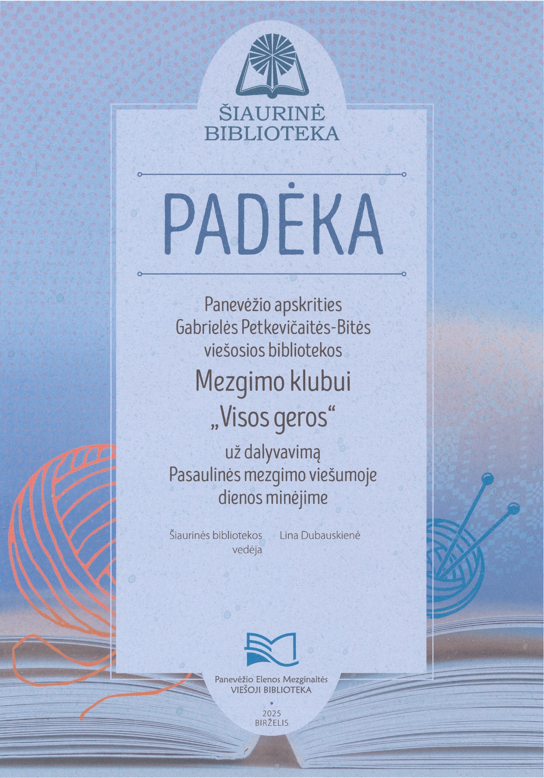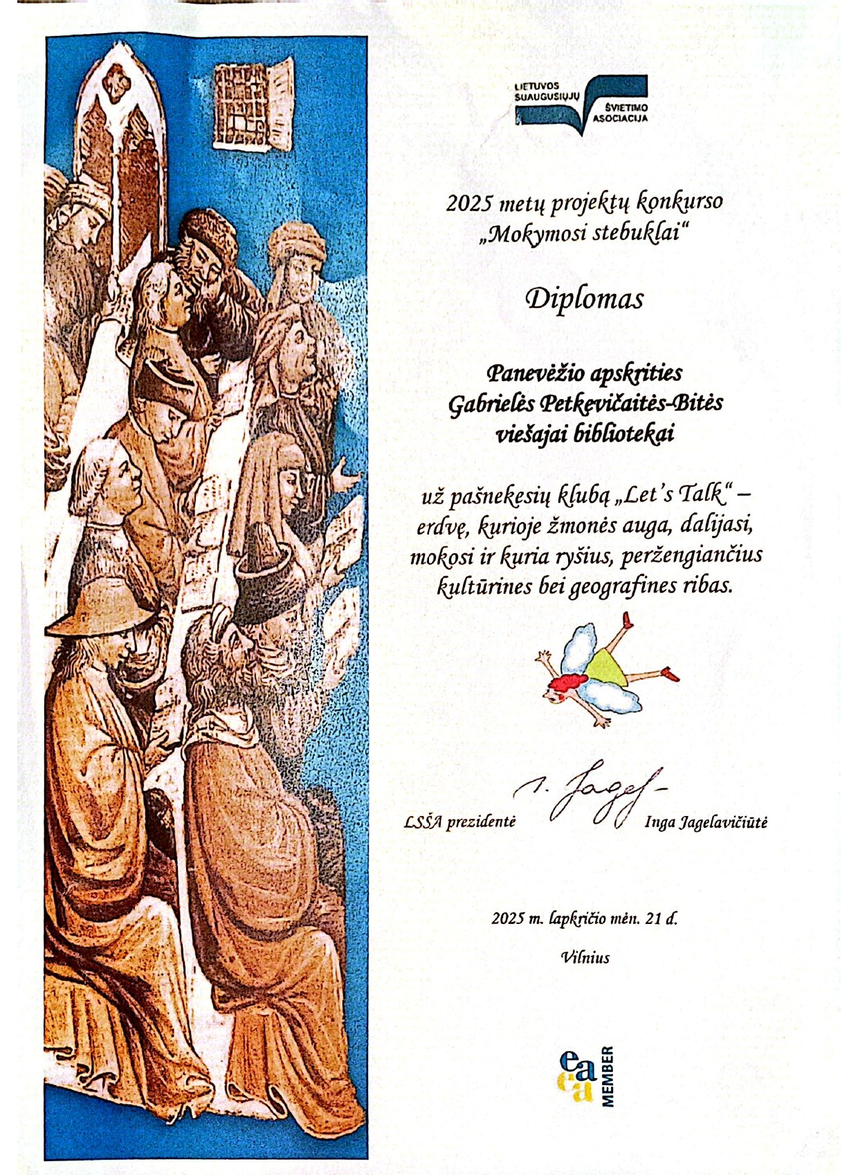 Panevėžio apskrities Gabrielės Petkevičaitės-Bitės viešajai bibliotekai įteiktas Lietuvos suaugusiųjų švietimo asociacijos 2025 metų projektų konkurso „Mokymosi stebuklai“ diplomas už pašnekesių klubą „Letꞌs Talk“ – erdvę, kurioje žmonės auga, dalijasi, mokosi ir kuria ryšius, peržengiančius kultūrines bei geografines ribas.