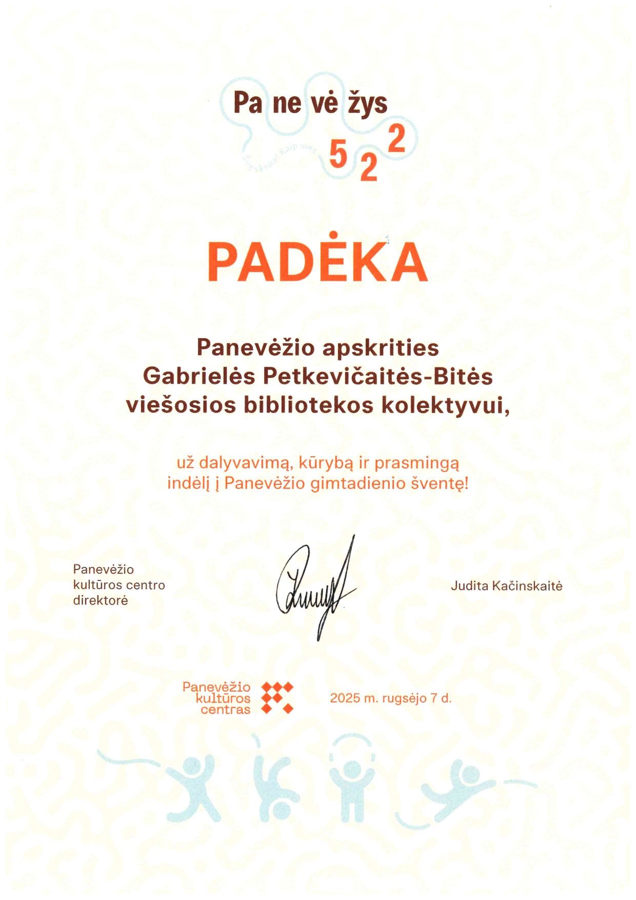 Bibliotekos kolektyvui už dalyvavimą, kūrybą ir prasmingą indėlį į Panevėžio 522-ojo gimtadienio šventę įteikta Panevėžio kultūros centro direktorės Juditos Kačinskaitės padėka.