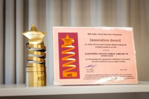 Bibliotekai įteiktas inovatyvaus mokymo apdovanojimas už projektą „Teaching English to Elderly” („Suaugusiųjų anglų kalbos mokymas“), kurį mūsų biblioteka kaip partnerė įgyvendino su Latvijos NVO „Vecmaminas.lv”. Apdovanojimą skyrė Europos Komisija kategorijoje „Aktyvus pilietiškumas“.