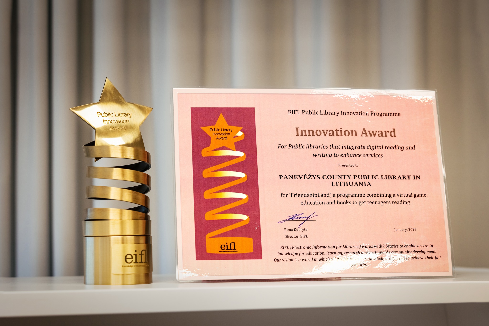Biblioteka – viena iš trijų pasaulio įstaigų ir organizacijų, 2025 m. pelniusi tarptautinį EIFL viešųjų bibliotekų inovacijų apdovanojimą už programą „Draugoteka“, derinančią virtualų žaidimą, švietimą ir knygas, skatinančią paauglius skaityti. EIFL apdovanojimą sudarė 1 500 JAV dolerių premija, sertifikatas ir statulėlė.