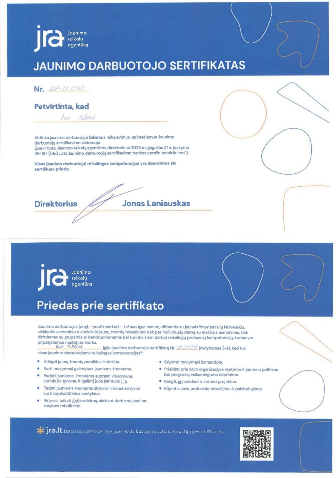 Atviros jaunimo erdvės veiklų jaunimui organizatorei Rasai Tubienei įteiktas Jaunimo darbuotojo sertifikatas, patvirtinantis aukštas kompetencijas dirbant su jaunimu ir organizuojant kokybiškas neformaliojo ugdymo veiklas.
