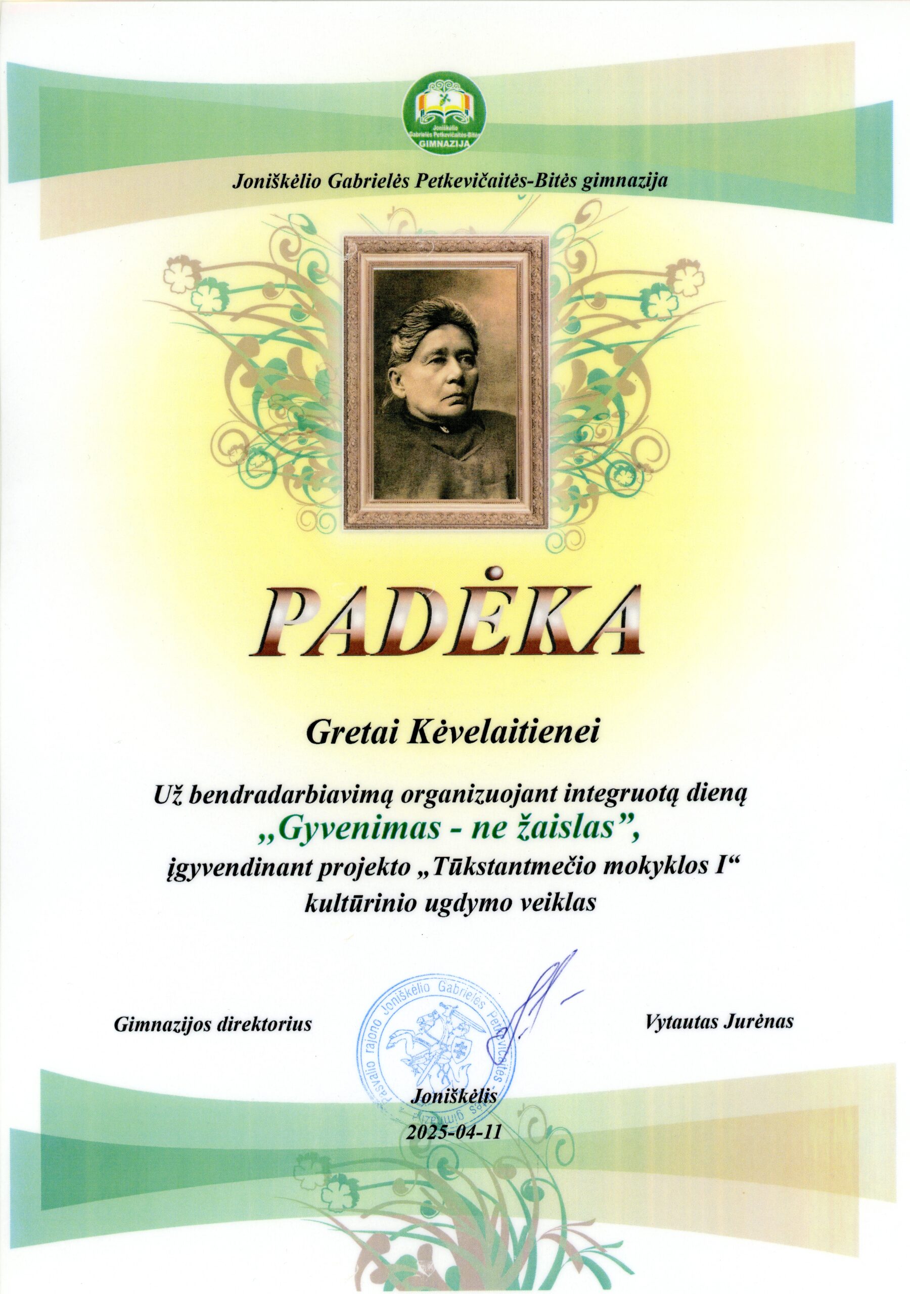 Panevėžio apskrities Gabrielės Petkevičaitės-Bitės viešosios bibliotekos vyriausiajai bibliotekininkei Angelei Mikelinskaitei įteikta padėka: „Nacionalinis kultūros kelias „Vėtrungių kelias“ nuoširdžiai dėkoja Jums už dalyvavimą konferencijoje „Kultūros kelių istorijos: patirtys, iššūkiai ir ateitis“. Dėkojame už Jūsų skirtą laiką, dalijimąsi žiniomis ir gerąja praktika, kuri praturtino konferencijos turinį bei įkvėpė naujoms idėjoms kultūros kelių plėtroje. Jūsų indėlis yra itin vertingas stiprinant bendradarbiavimą tarp kultūros kelių bei ieškant bendrų ateities perspektyvų.“