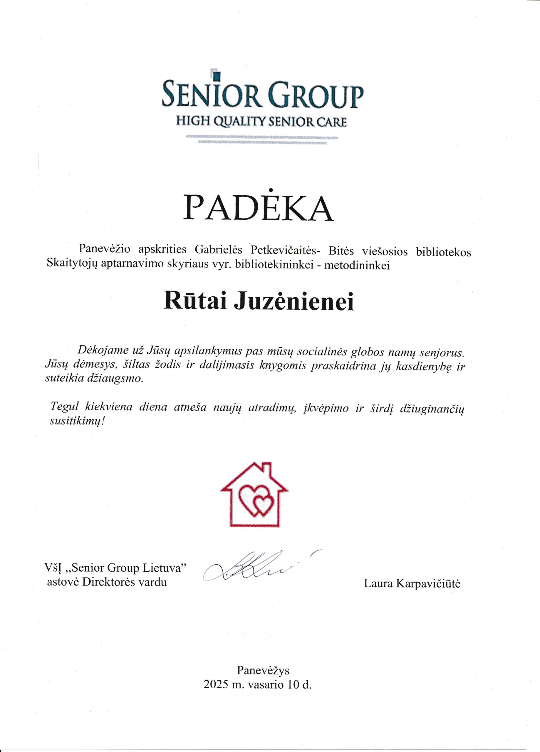 Bibliotekos Skaitytojų aptarnavimo skyriaus vyriausiajai bibliotekininkei-metodininkei Rūtai Juzėnienei įteikta „Senior Group High Quality Senior Care“ padėka: „Dėkojame už Jūsų apsilankymus pas mūsų socialinės globos namų senjorus, Jūsų dėmesys, šiltas žodis ir dalijimasis knygomis praskaidrina jų kasdienybę ir suteikia džiaugsmo. Tegul kiekviena diena atneša naujų atradimų, įkvėpimo ir širdį džiuginančių susitikimų.“