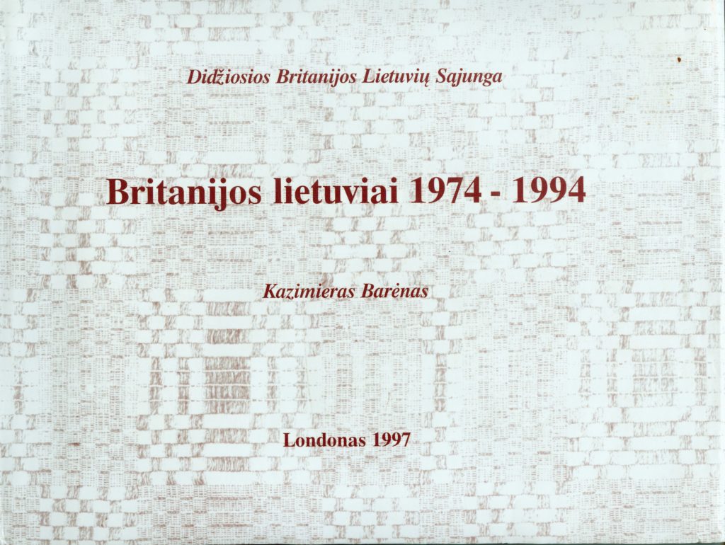 Britanijos lietuviai, 1974-1994 : [veiklos apžvalga] / Kazimieras Barėnas ; Didžiosios Britanijos lietuvių sąjunga. – Londonas : [Didžiosios Britanijos lietuvių sąjunga], 1997 (Ebbw Vale : Print. by Creative print a. design (Wales)). – VI, 407, [1] p. : iliustr. PAVB S13483