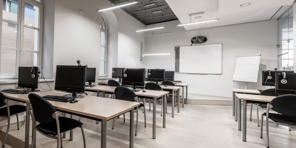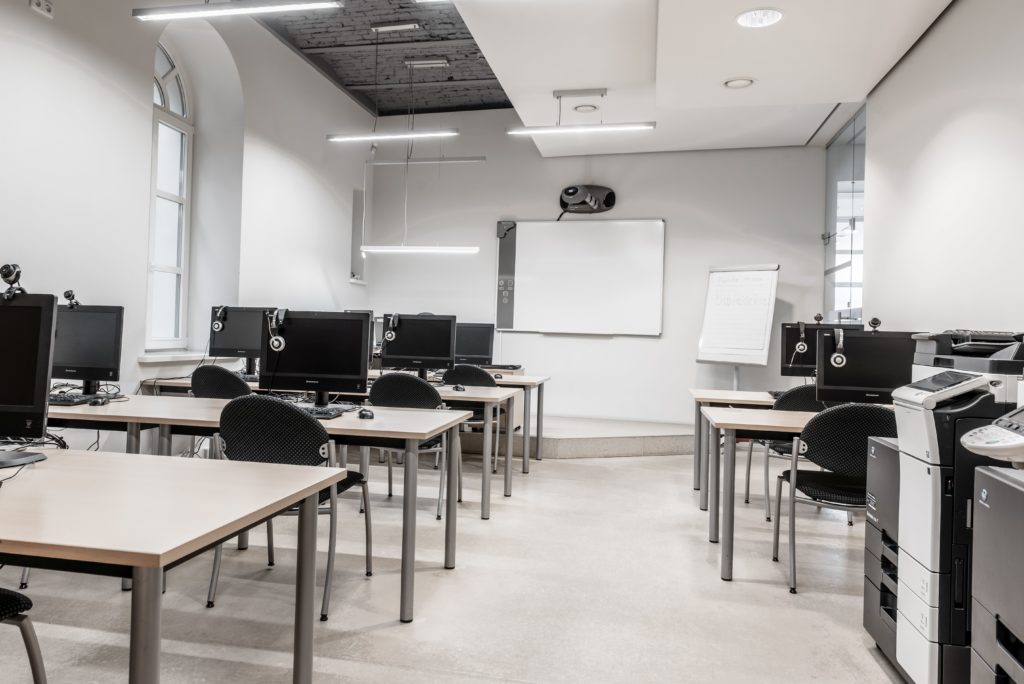 Mokymų klasė su SMART interaktyvia lenta. Yra 11 kompiuterizuotų darbo vietų. 1 val. – 25, 00 Eur. 1 darbo diena – 140 Eur.